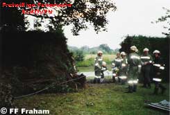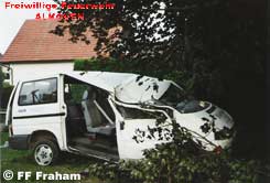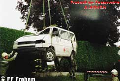 Am frühen Morgen des 13. August 2005 wurde die FF Fraham zu einem Verkehrsunfall auf die B 129 in der Ortschaft Goldenberg alarmiert. Ein Transporter lag nach einem Unfall in einem Garten. Über die Landeswarnzentrale erfolgte gegen 06.20 Uhr die telefonische Anforderung des Kranfahrzeuges, worauf drei Mann zur Hilfeleistung abrückten. |