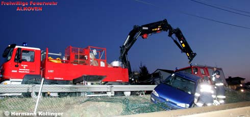 Um 07.01 Uhr wurde der Kommandant der Feuerwehr Alkoven telefonisch über eine anstehende Fahrzeugbergung nach einem Unfall auf der B 129 nahe dem Feuerwehrhaus informiert. Ein Pkw würde auf den Gleisen der Linzer Lokalbahn stehen. Nach dem Auslösen der Personenrufempfänger der Gruppe "Kraneinsatz" konnten die Einsatzkräfte bis auf die Lenker des Kran- und Rüstlöschfahrzeuges gleich zu Fuß zur nahegelegenen Unfallstelle gehen. |